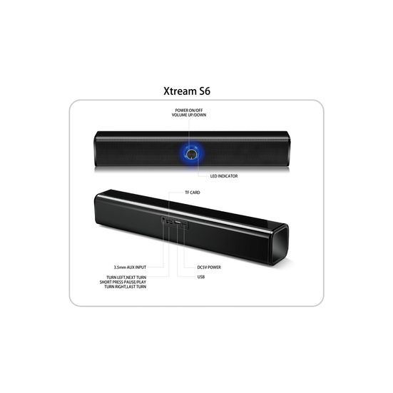 The Adesso Xtream S6 is a high power Bluetooth desktop sound bar speaker, featuring bass subwoofer technology. Immerse yourself in the rich sound of music, movies, and games as this speaker system is integrated with dual 10W speaker units that deliver mind blowing stereo sound. Suitable for home, office, and school. It is also a perfect gift for friends and family.